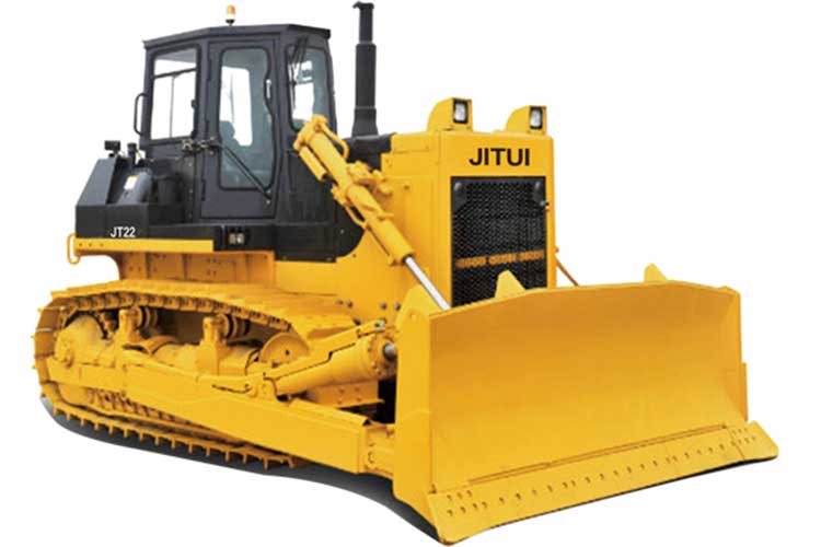 JT22推土機(jī)行走裝置由行走架、引導(dǎo)輪、履帶張緊裝置、托鏈輪、支重輪、履帶總成以及驅(qū)動(dòng)輪等組成,左右兩條履帶包繞在上述四種輪子之外,由張緊裝置張緊,直接與地面接觸。驅(qū)動(dòng)輪驅(qū)動(dòng)履帶繞四種輪子轉(zhuǎn)動(dòng),不直接在地面上滾動(dòng)。導(dǎo)向輪是張緊履帶,并引導(dǎo)它正確卷繞。若干個(gè)支重輪在履帶軌面上滾動(dòng),傳遞垂直載荷給履帶。托鏈輪支持著履帶的上半邊,使之不下垂,并可減小其上下振動(dòng)。上述四種輪子和張緊裝置,除驅(qū)動(dòng)輪外都集裝在一個(gè)輪架(即臺車架,也稱履帶架)上,從而形成一個(gè)臺車。每輛履帶車輛都有左、右兩個(gè)臺車。整車重量通過臺車架、支重輪傳給下方履帶,使下方履帶緊壓在地面上。當(dāng)驅(qū)動(dòng)輪被終傳動(dòng)齒輪(從動(dòng)齒輪)帶動(dòng)時(shí),輪齒拉動(dòng)履帶,地面立即產(chǎn)生作用在履帶上的反作用力,使臺車架相對地面產(chǎn)生向前或向后的運(yùn)動(dòng),整車也就隨之運(yùn)動(dòng)。