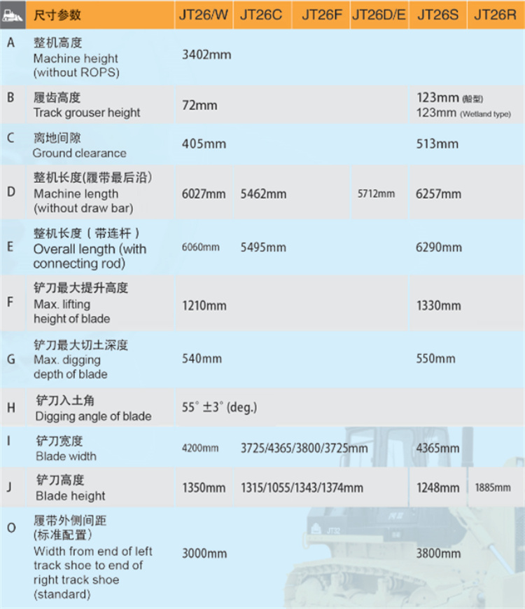 JT26推土機(jī)能單獨(dú)完成挖土、運(yùn)土和卸土工作,具有操作靈活、轉(zhuǎn)動(dòng)方便、所需工作面小、行駛速度快等特點(diǎn),可用于場(chǎng)地清理或平整,開挖深度不大的基坑以及回填,推筑高度不大的路基等。